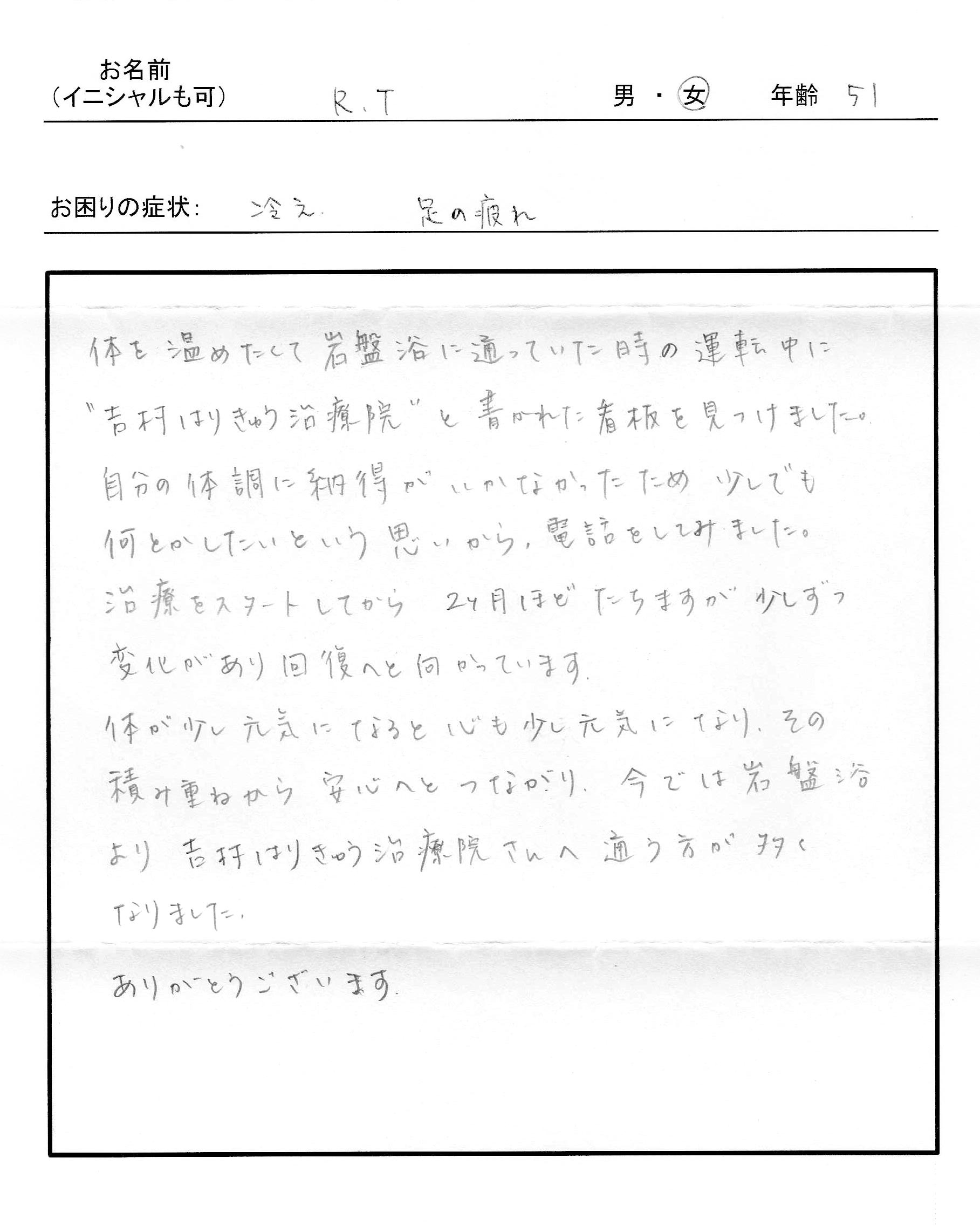 | 冷え、足の疲れ / R.T 女性 51歳 | ||||||