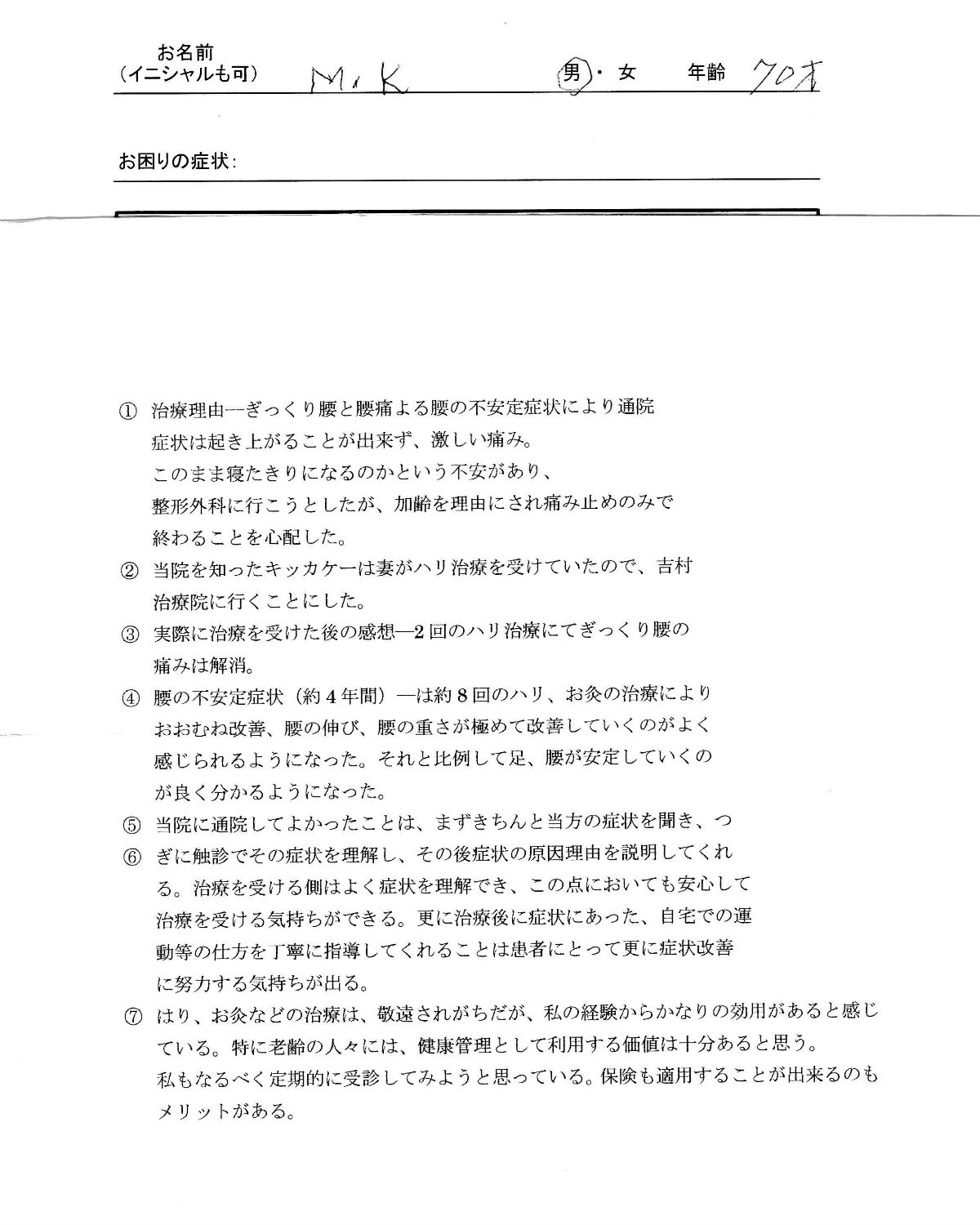 | 症状は起き上がる事が出来ず、激しい痛み。このまま寝たきりになるのかという不安があり、整形外科に行こうとしたが、 加齢を理由にされ痛み止めのみで終わることを心配した。 当院を知ったキッカケは妻がハリ治療を受けていたので、吉村治療院に行くことにした。 実際に治療を受けた感想 ― 2回のハリ治療にてぎっくり腰の痛みは解消。 腰の不安定症状(約4年間)は約8回のハリ、お灸の治療によりおおむね改善、腰の伸び、腰の重さが極めて改善していくのがよく感じられるようになった。それと比例して足、腰が安定していくのが良く分かるようになった。 当院に通院して良かったことは、まずきちんと当方の症状を聞き、つぎに触診でその症状を理解し、その後症状の原因理由を説明してくれる。治療を受ける側はよく症状を理解でき、この点においても安心して治療を受ける気持ちができる。更に治療後に症状にあった、自宅での運動等の仕方を丁寧に指導してくれることは患者にとってさらに症状完全に努力する気持ちが出る。 はり、お灸などの治療は、敬遠されがちだが、私の経験からかなりの効用があると感じている。 特に老齢の人々には、健康管理として利用する価値は十分あると思う。私もなるべく定期的に受診してみようと思っている。保険も適用することが出来るのもメリットがある。