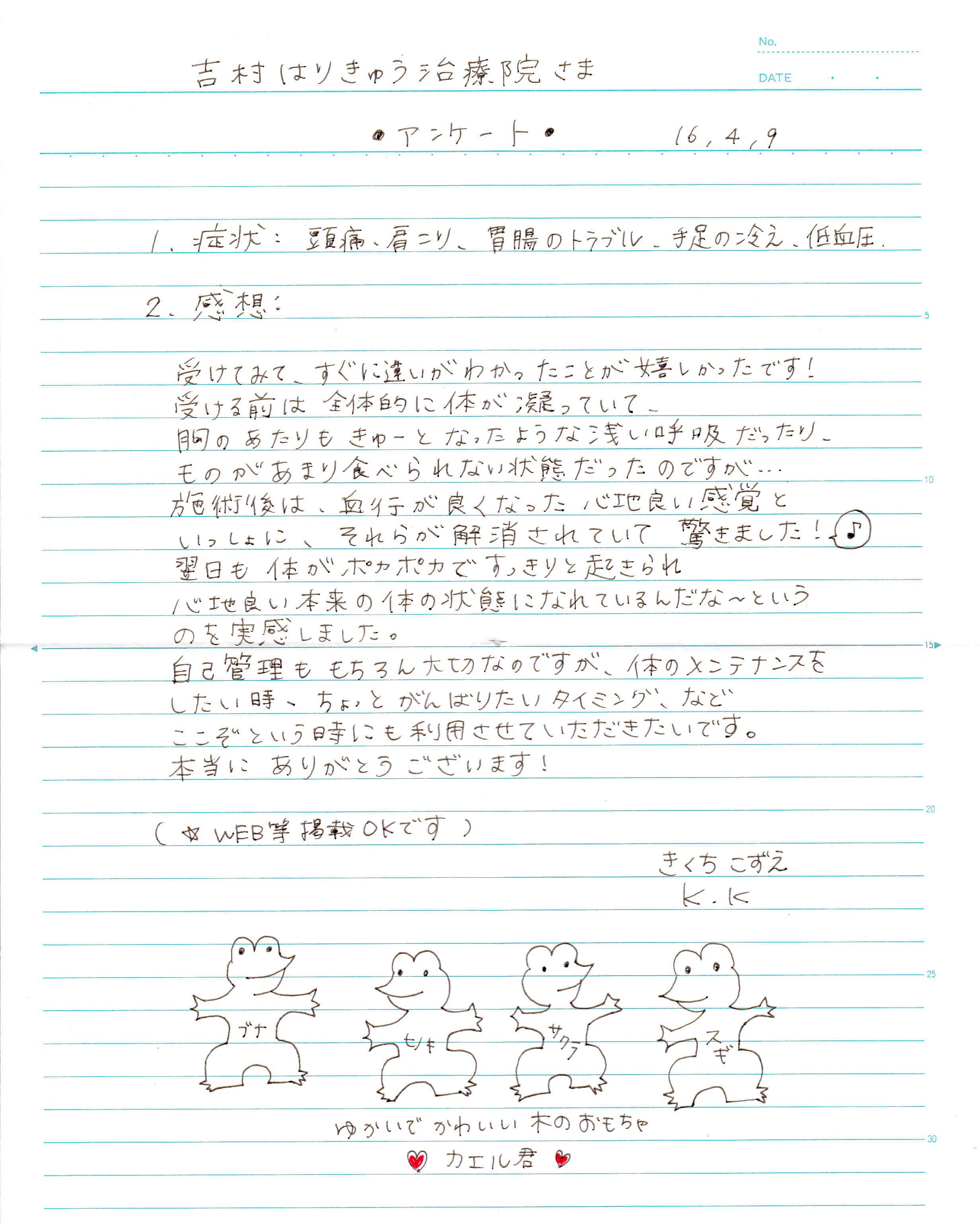 | 私は、はりの経験は全くなかったのですが、美容鍼にとても興味があったので、インターネット検索でこちらの治療院を知りました。 ホームページから丁寧さと清潔感が伝わってきたのでさっそく電話で予約をとらせていただきました。 カウンセリングもとても話しやすかったので自分の身体の事を細かく伝える事が出来たし、はりの使い捨てなど衛生面も徹底していることがわかり安心して施術を受けることが出来ました。 効果もとてもあるので定期的に施術していただきたいと思っています。今はストレートネックのせいかたびたび悩まされる首・肩のコリをほぐしてもらいに通わせていただいています。 施術の後は軽い運動をした後のようにぐっすり眠れます。身体がこわばっていたんだと実感できました。 いつもありがとうございます。 ※ご希望により原文の掲載は省略いたします。 |