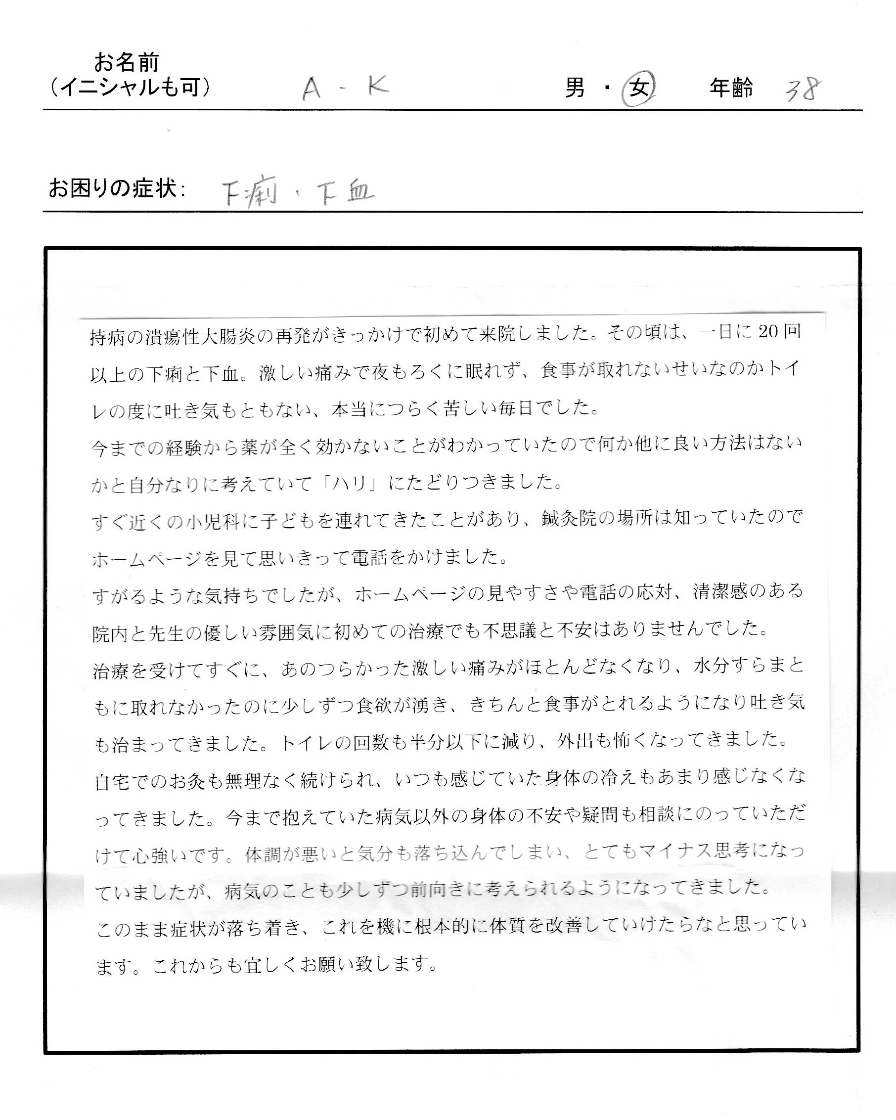 | 持病の潰瘍性大腸炎の再発がきっかけで始めて来院しました。 その頃は、一日に20回以上の下痢と下血。激しい痛みで夜もろくに眠れず、食事がとれないせいなのかトイレの度に吐き気もともない、本当につらく苦しい毎日でした。 今までの経験から薬が全く効かないことがわかっていたので何かほかに良い方法はないかと自分なりに考えていて「ハリ」にたどりつきました。 すぐ近くの小児科に子どもを連れてきたことがあり、鍼灸院の場所は知っていたのでホームページを見て思いきって電話をかけました。すがるような気持ちでしたが、ホームページの見やすさや電話の対応、清潔感のある院内と先生の優しい雰囲気に初めての治療でも不思議と不安はありませんでした。 治療を受けてすぐに、あのつらかった激しい痛みがほとんどなくなり、水分すらまともに取れなかったのに少しずつ食欲が湧き、きちんと食事がとれるようになり吐き気も治まってきました。トイレの回数も半分以下に減り、外出も怖くなくなってきました。自宅でのお灸も無理なく続けられ、いつも感じていた身体の冷えも感じなくなってきました。今まで抱えていた病気以外の身体の不安や疑問も相談にのっていただけて心強いです。 体調が悪いと気分も落ち込んでしまい、とてもマイナス思考になっていましたが、病気の事も少しづつ前向きに考えられるようになってきました。このまま症状が落ち着き、これを機に根本的に体質を改善していけたらなと思っています。これからもよろしくお願い致します。