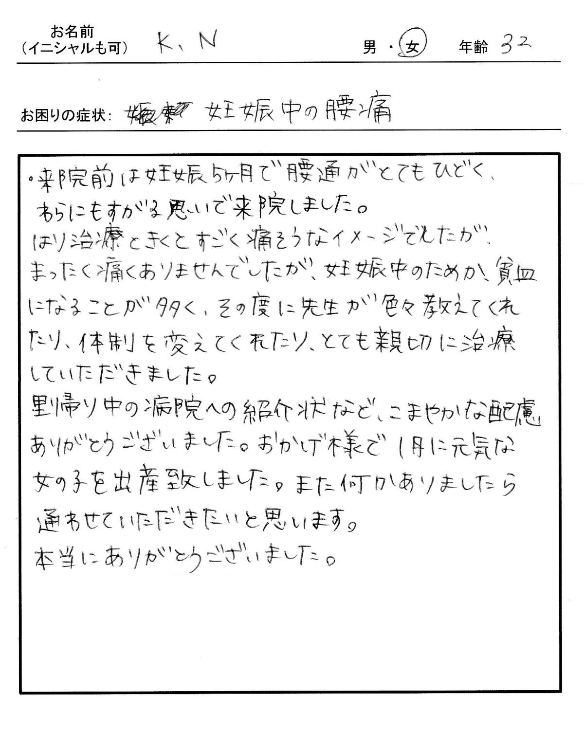 | 来院前は妊娠5ヶ月で腰痛がとてもひどく、わらにもすがる思いで来院しました。 はり治療ときくとすごく痛そうなイメージでしたが、まったく痛くありませんでしたが、妊娠中のためか、貧血になることが多く、その度に先生がいろいろ教えてくれたり、体勢を変えてくれたり、とても親切に治療していただきました。里帰り中の病院(鍼灸院)への紹介状など、こまやかな配慮ありがとうございました。 おかげ様で1月に元気な女の子を出産致しました。また何かありましたら通わせていただきたいと思います。本当にありがとうございました。