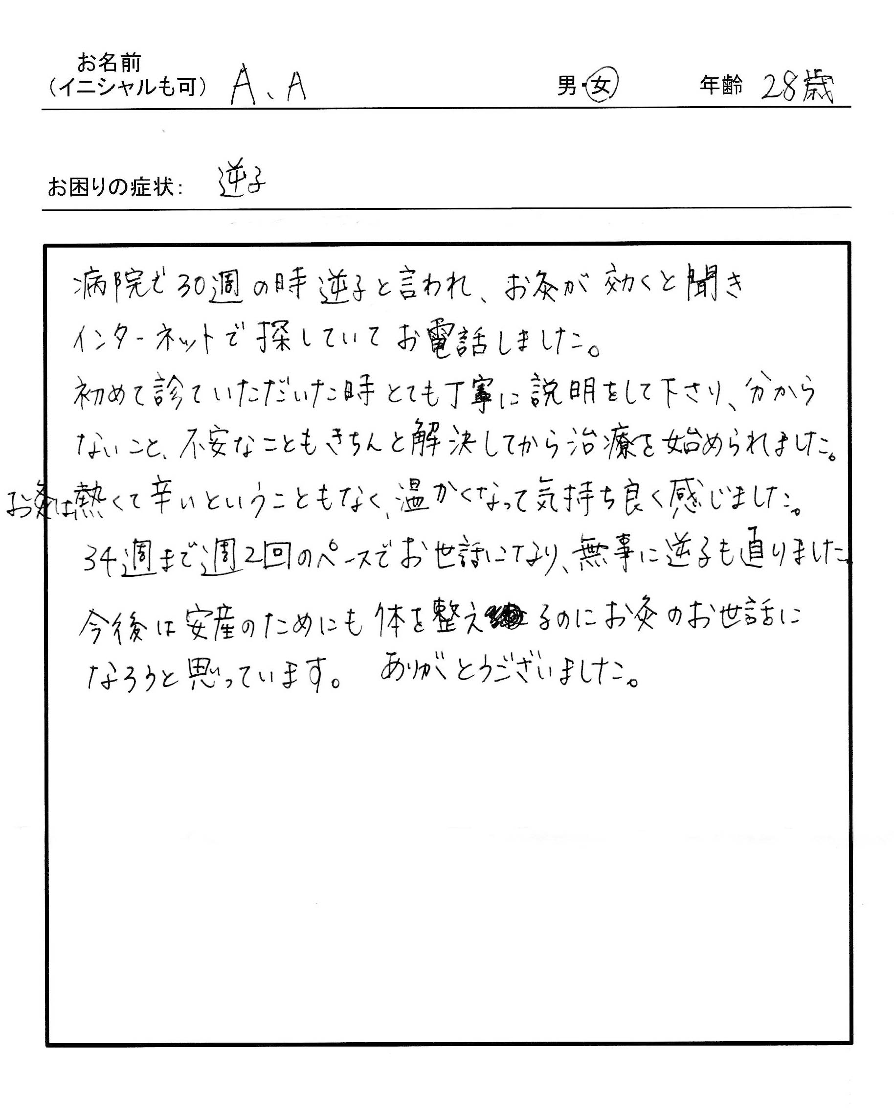 | 病院で30週の時に逆子と言われ、お灸が効くと聞きインターネットで探していてお電話しました。 初めて見ていただいた時とても丁寧に説明をして下さり、分からないこと、不安なこともきちんと解決してから治療を始められました。お灸は熱くて辛いということもなく、温かくなって気持ちよく感じました。34週まで週2回のペースでお世話になり、無事に逆子も直りました。今後は安産のためにも体を整えるのにお灸のお世話になろうと思っています。ありがとうございました。