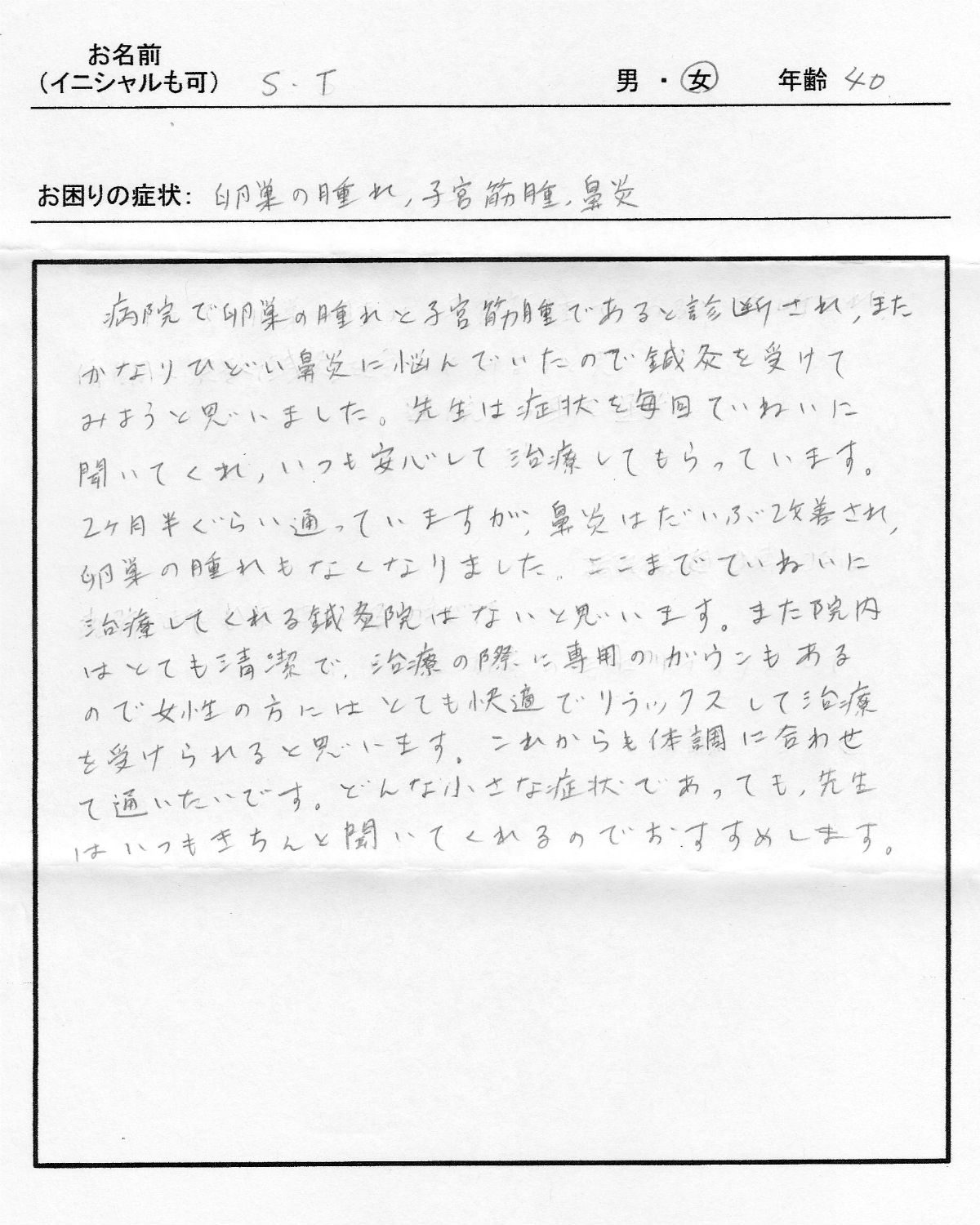 | 卵巣の腫れ、子宮筋腫、鼻炎/S.T、女性、40歳 | ||||