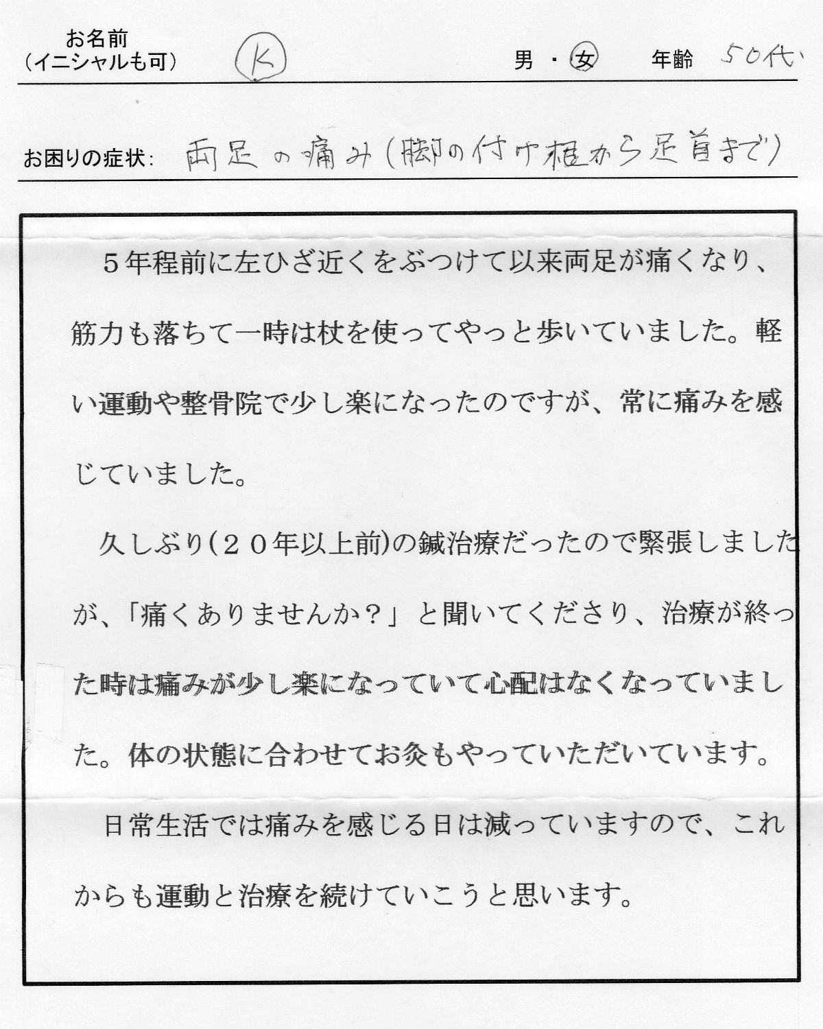 | 両足の痛み/K、女性、50代 | ||||