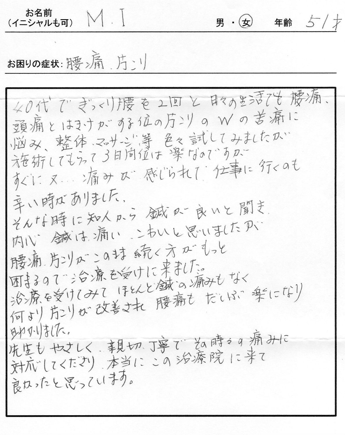 | 腰痛、肩こり/M.I、女性、51歳 | ||||