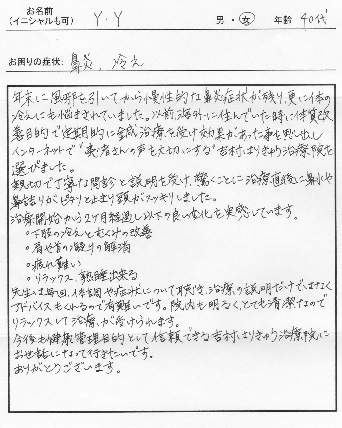 | 年末に風邪を引いてから慢性的な鼻炎症状が残り、更に体の冷えにも悩まされていました。 以前、海外に住んでいた時に体質改善目的で定期的に鍼治療を受け効果があった事を思い出しインターネットで“患者さんの声を大切にする”吉村はりきゅう治療院を選びました。 親切で丁寧な問診と説明を受け、驚くことに治療直後に鼻水や鼻詰りがピタリと止まり頭がスッキリしました。 治療開始から2ヶ月経過し以下の良い変化を実感しています。 ・下肢の冷えとむくみの改善 ・肩や首の凝りの解消 ・疲れ難い ・リラックス、熟睡できる 先生は毎回、体調や症状について聴き、治療の説明だけではなくアドバイスもくれるので有難いです。院内も明るく、とても清潔なのでリラックスして治療が受けられます 今後も健康管理目的として信頼できる吉村はりきゅう治療院にお世話になって行きたいです。 ありがとうございます。